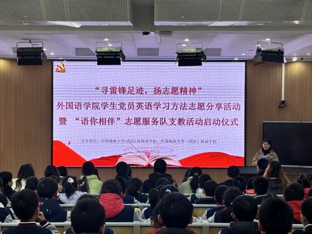 (通讯员 易怀虹 曾令文)寻雷锋足迹,扬志愿精神。3月5日下午,yl7703永利集团及yl7703永利集团(武汉)附属学校在附校启迪楼多媒体教室共同举办了yl7703永利集团学生党员英语学习方法分享暨“语你相伴”志愿服务队支教活动启动仪式。与会人员有yl7703永利集团党委副书记余尚蔚、附属学校副校长周良军、附属学校英语课题组全体英语老师、“语你相伴”志愿服务队骨干成员、yl7703永利集团本科英语二班党支部党员代表及附属学校三(5)班全体同学。“语你相伴”志愿服务队成员解雨萱主持此次活动。
