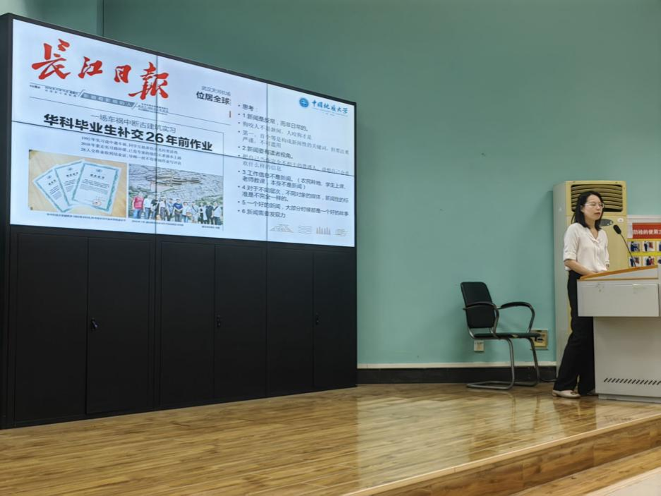 王俊芳老师简要阐述了“什么样的新闻是有价值的”,并为我们详细讲解了“如何写出好标题”、“拟写技巧”以及“导语的写法”等具体新闻写作技巧。随后王老师指出“人物和故事是新闻的核心”,写作者应站在受众的角度思考问题,关注“人”,重视“人”。
