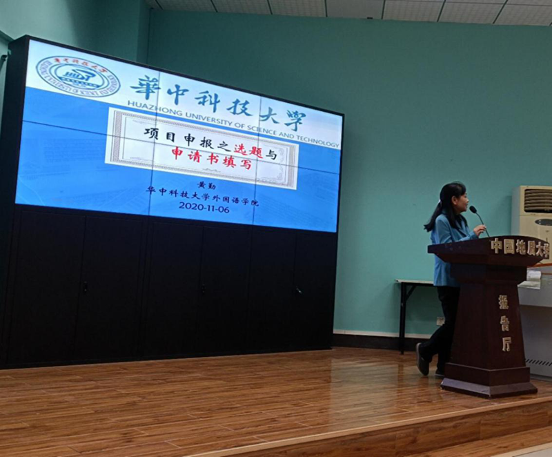 2020年11月6日上午9点,yl7703永利集团“南望今声”外语论坛系列讲座第十六讲在北一楼报告厅正式拉开帷幕。华中科技大学博士生导师黄勤教授应邀为永利集团官网师生做题为“项目申报之选题与申请书填写”的讲座。讲座由yl7703永利集团院长张峻峰教授主持,学院部分教师和研究生同学到场聆听。