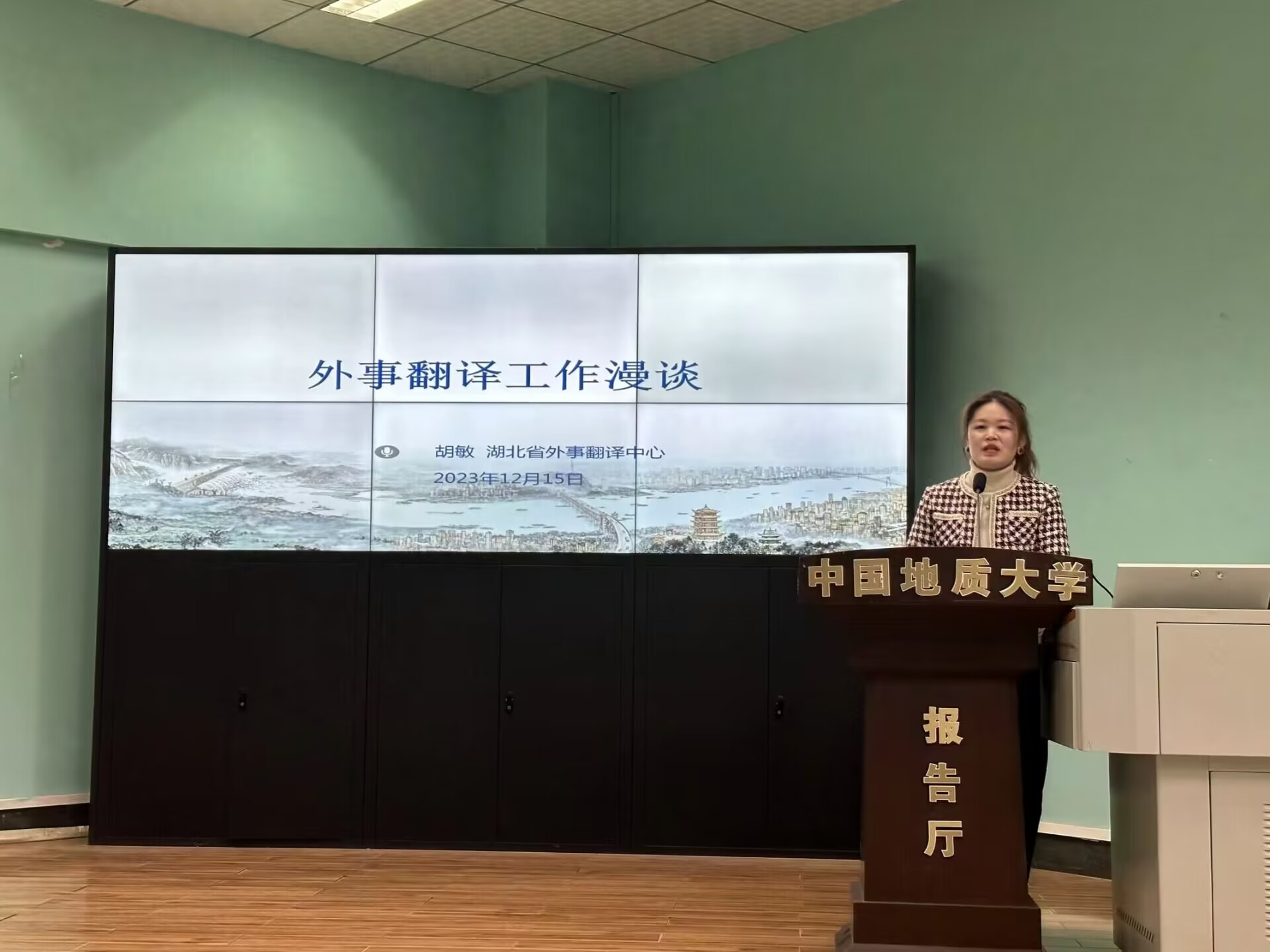 2023年12月15日上午9时00分,yl7703永利集团“南望今声”外语论坛系列讲座第60期在北一楼120学术报告厅举行。主讲人湖北省外事翻译中心英语翻译胡敏女士,应邀开展了主题为“外事翻译工作漫谈”的精彩讲座。此次讲座由yl7703永利集团杨红燕副教授主持,八十余名师生参会。