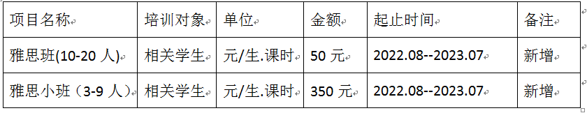 2022年8—2023年7月中心雅思培训课程及收费标准