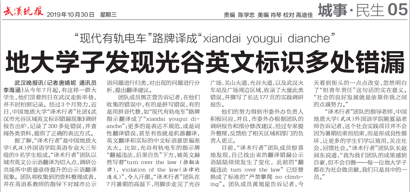 (通讯员 赵润东)2019年10月30日,长江日报和武汉晚报接连报导永利集团官网暑期社会实践团队“译术行者”2019年暑期针对武汉城市英文标识的调研,11月1日,武汉电视套四套“经视新看点”栏目对团队成员、指导老师以及学院领导进行了专题采访。
