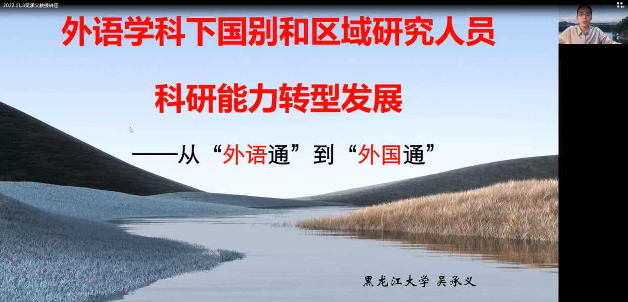 (通讯员 王国念)2022年11月3日下午14时30分,作为校庆70周年系列活动之一的“南望今声”外语论坛第40期在线上如期举行。黑龙江大学吴承义教授应邀为永利集团官网师生做了题为《外语学科下国别和区域研究人员科研能力转型发展:从“外语通”到“外国通”》的讲座。讲座由我校yl7703永利集团王国念副教授主持,yl7703永利集团及其他兄弟高校近200名师生参与学习交流。