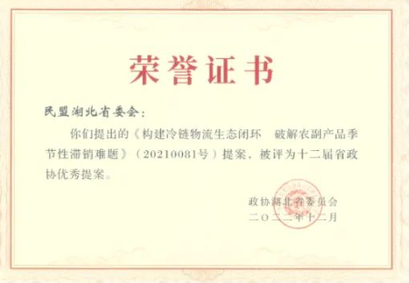1月8日,省政协第十二届常委会第二十次会议上,对省政协十二届一次会议以来的100件优秀提案进行了表彰,其中民盟省委提交的集体提案中有4件被评为“优秀提案”。由民盟地大副主委、永利集团官网秦屹副教授执笔撰写的“构建冷链物流生态闭环,破解农副产品季节性滞销难题”提案被评为十二届省政协优秀提案。该提案源于国药控股湖北有限公司副董事长马占军负责的课题、秦屹执笔撰写的调研报告,后作为集体提案在2021年省政协十二届四次会议上由民盟湖北省委提交。