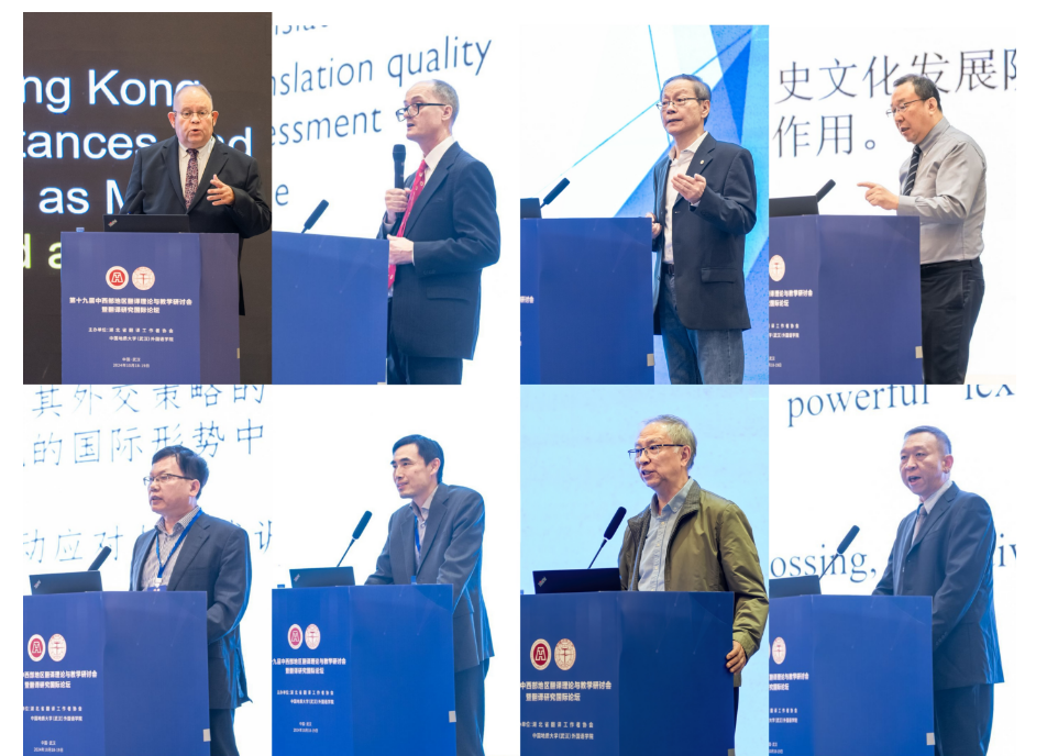 香港城市大学中文、翻译和语言学系系主任 Jonathan Webster教授、香港恒生大学翻译及外语学院院长Mark Shuttleworth教授、香港中文大学(深圳)翻译学朱纯深教授、武汉大学外国语言文学学院刘军平教授、上海外国语大学校长助理胡开宝教授。北京外国语大学高级翻译学院副院长姚斌教授、上海外国语大学高级翻译学院柴明熲教授、yl7703永利集团院长张峻峰教授等8位专家分别作主旨演讲。主旨发言涵盖了数智时代的翻译技术与实践应用、元宇宙翻译范式与跨文化传播、翻译研究领域的发展变化、现代翻译行业发展、人工智能时代口译教学与研究新趋势、外交话语翻译等多个研究领域,发言高屋建瓴、深入浅出,既有前瞻性、开拓性和学理性,又不乏指导性、实践性和应用性,为中西部地区乃至全国翻译学界和业界的可持续性发展与创新发展提供了多维研究思路。