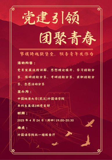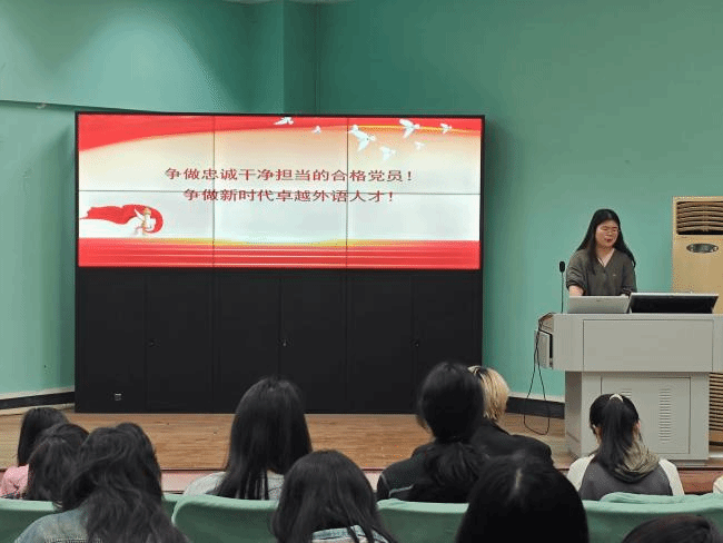 2025 年 4 月 24 日晚 19:00至20:30,yl7703永利集团本科生英语2班党支部于北一楼报告厅举办 “擎旗铸魂强堡垒,服务青年展作为——党建引领・团聚青春”主题联动大会。本次活动以强化党建带动团建作用、服务青年成长为核心,通过理论学习、经验分享等形式,凝聚青年力量,筑牢思想根基。本2支部党员代表及2024级全体本科生共同参与。