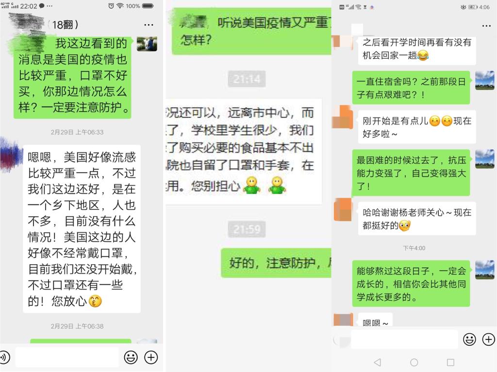 王伟老师的一个学生在美国孔子学院做汉语志愿者,在得知美国疫情加重之后,王老师经常与学生联系,提醒学生加强防护。杨红燕老师的一个学生整个寒假都留在学校,在疫情最紧张的时候杨老师一直与其保持联系,关注其生活是否有困难,鼓励她坚强成长。